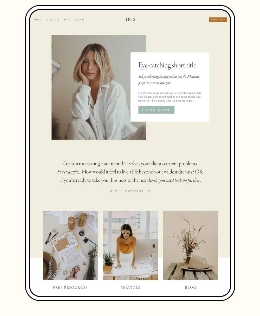 Elizabeth Ellery sells stylish and simple to use Squarespace Website Templates. These designer templates allow you to launch your new website quickly! All templates are strategically designed for service based businesses to start attracting dream clients. All you need to do is change the images, edit the copy, hit publish & you’re live!