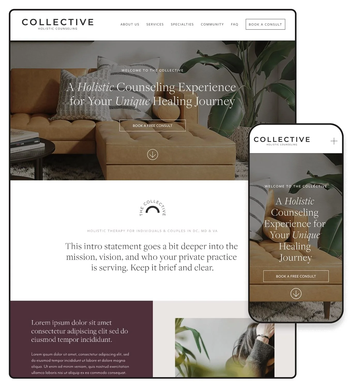 Walker Strategy Co. is a modern Squarespace template shop that allows therapists to purchase a professional website template. Their collection of therapy website templates are designed with a proven, client-attracting framework. When you buy a Squarespace template from their shop, you’ll get immediate access to a launch course: a step-by-step guide for everything from changing fonts and colors, to adding your content, to optimizing for SEO.