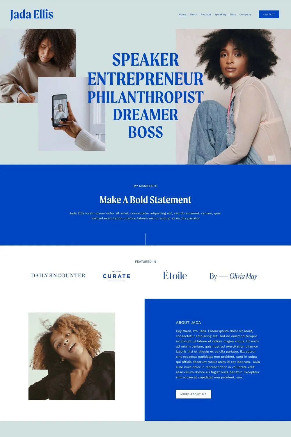 The Jada Template is a modern, editorial, and sleek Squarespace Fluid Engine Template made for CEOs, speakers, and podcasters. The design features bold typography, unique use of imagery, and dynamic video elements.
