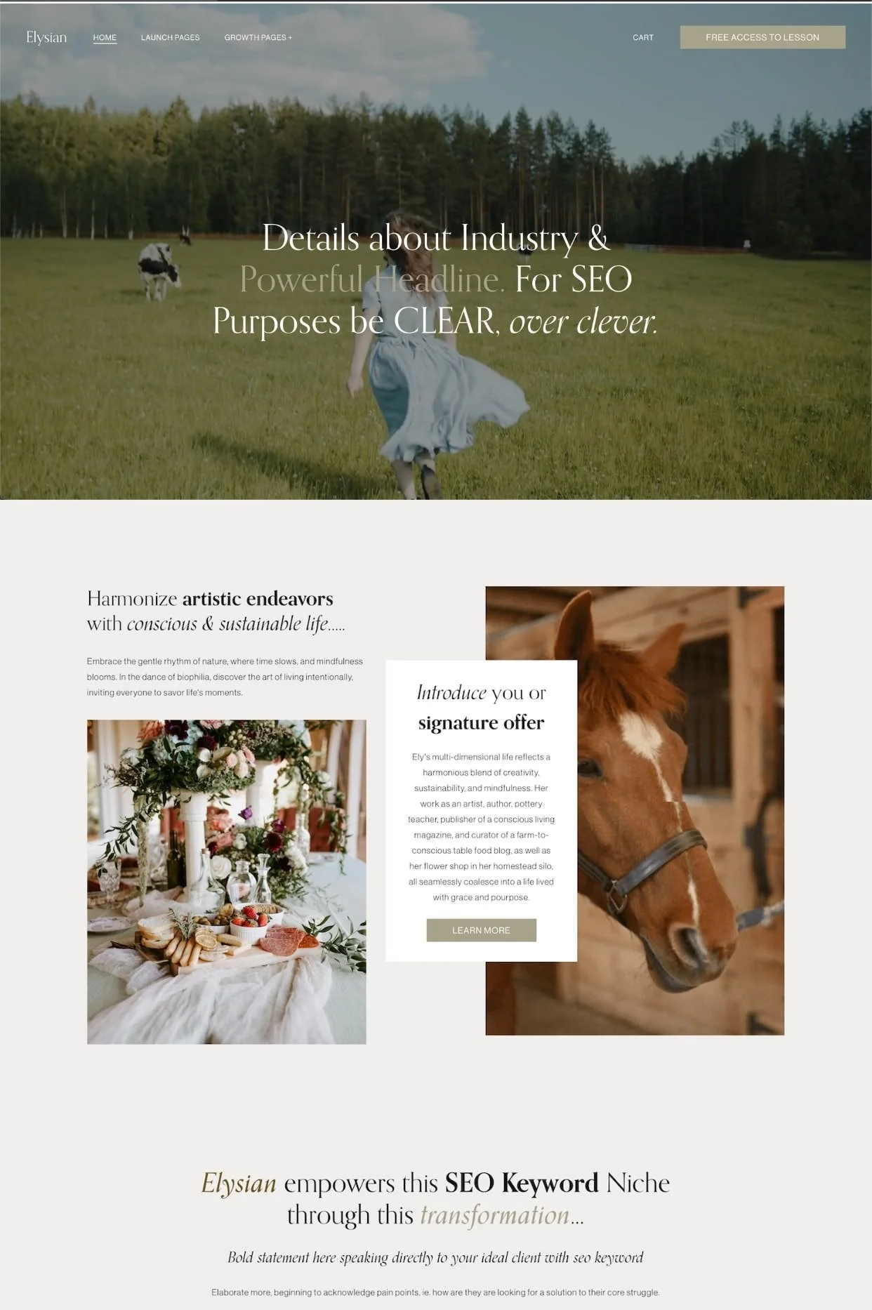 Elysian is as beautifully crafted as it is functional, powered by Squarespace's robust all-in-one ecosystem. This template invites you to breathe new life into your digital world, mirroring the refreshing, rejuvenating spirit of a life lived in harmony with nature. It's an invitation to reset, start anew, and coexist with the natural world, just as seamlessly as your all-in-one ecosystem supports and enhances your online journey.