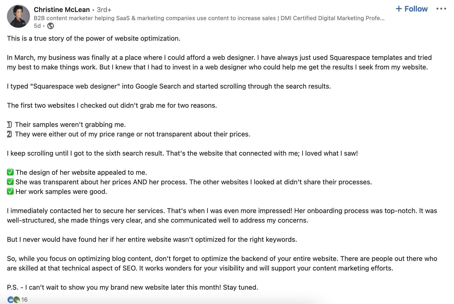 Our project began in early May. I kicked off the project with some important keyword research. I put together a list of keywords that I would later use to optimize the backend of her website for Google. One of the popular keywords we decided to use on the site was “Content Writing Packages” which she is now ranking for on the first page of Google, 4th spot, yay! 🎉