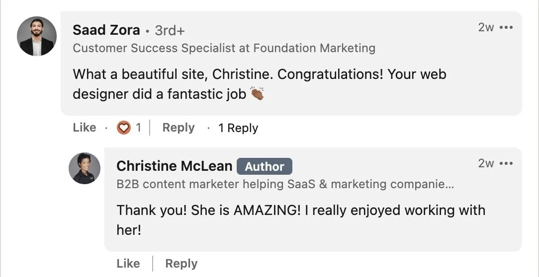 I continue to be impressed, Elise. Thank you so much for your fantastic work. It's been an absolute pleasure working with you and I'll be recommending you to anyone who asks about my new website!"