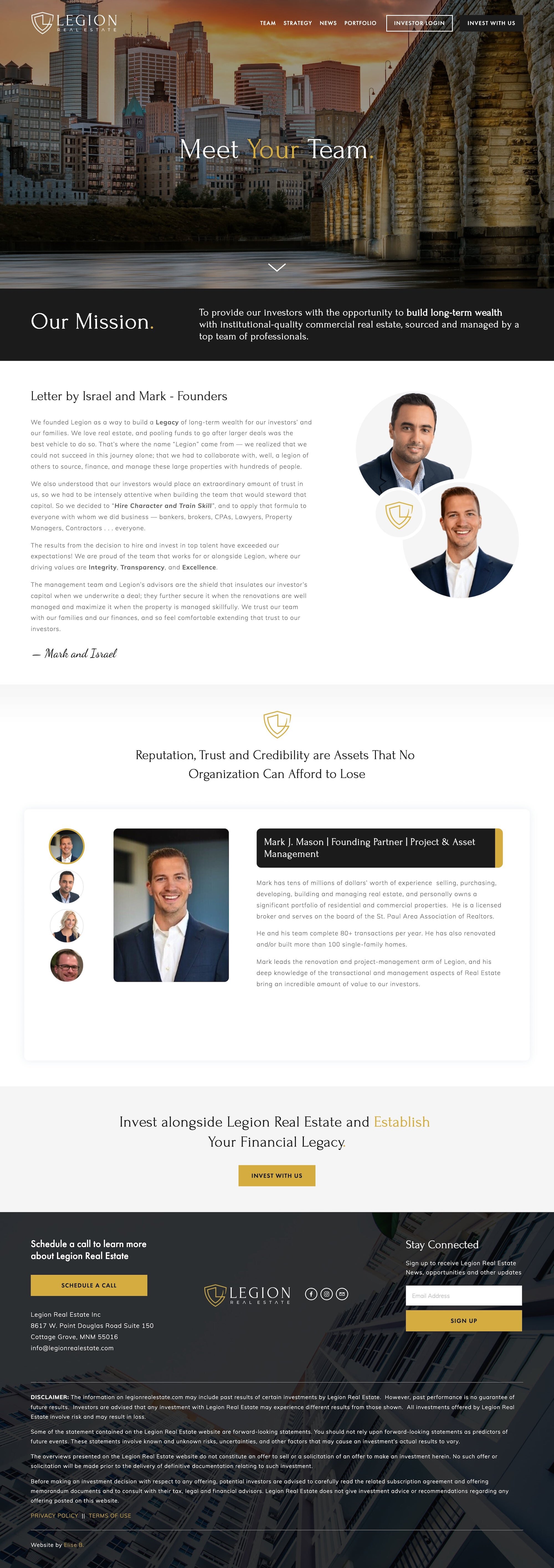 Legion Real Estate is a legacy real estate investment company that specializes in multifamily apartment acquisitions and management. They have been in business for 5+ years but have never had a website. They wanted a brand new website to highlight how valuable their management team and advisors are. They also needed a space to showcase their current investors’ results, as well as bring in new investors. They were seeking a clean, elegant and user-friendly design.